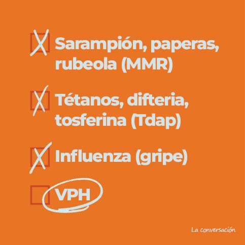 Virus delpapiloma humano (VPH): El VPH es un grupo de más de 150 virus transmitidos a través del contacto íntimo piel con piel que infecta a unos 14 millones de personas en los EE. UU. cada año. El VPH es la principal causa de cáncer de cuello uterino y también puede causar verrugas genitales, así como cáncer de vulva, vagina, pene, ano, boca y garganta. Incluso sin síntomas, las personas infectadas pueden transmitir el virus a otras personas. La mayoría de las infecciones nuevas ocurren en adolescentes y adultos jóvenes de poco más de veinte años, por lo que es importante asegurarse de que su hijo esté protegido mediante la vacunación antes de la exposición al VPH. La serie de vacunas contra el VPH se recomienda tanto para mujeres como para hombres a partir de los 11-12 años de edad y para aquellos que no han sido vacunados previamente, hasta los 26 años para las mujeres y los 21 años para los hombres.